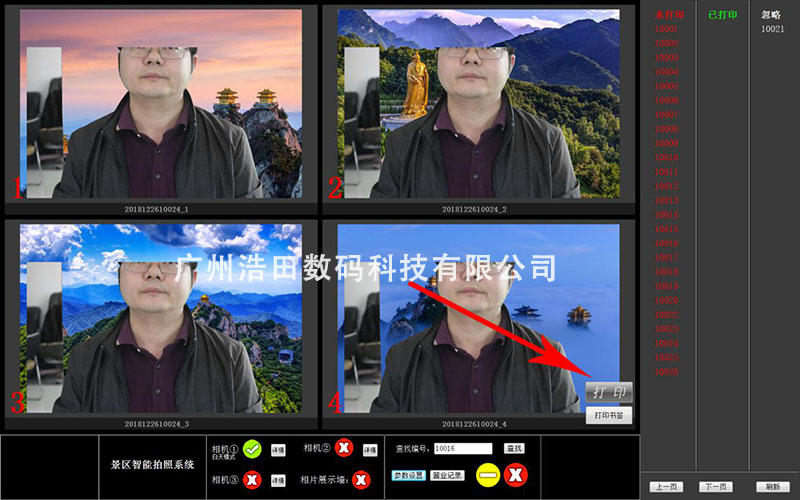 1. 人拍照完成后,電腦后臺可出現打印編號和{4張圖片}任選打印,打印方式直接將鼠標移至該圖片右下角會顯示【打印】按鈕