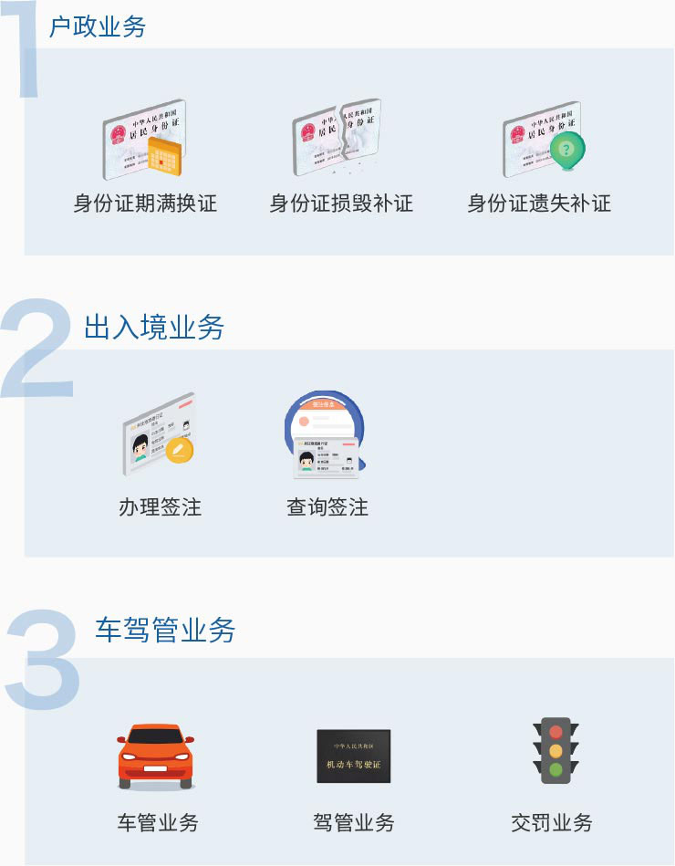 可自助辦理證件照拍攝、居住證業務、身份證補換領業務、駕駛證、行駛證查詢、違法信息查詢及其他業務辦理、港澳簽注業務辦理。